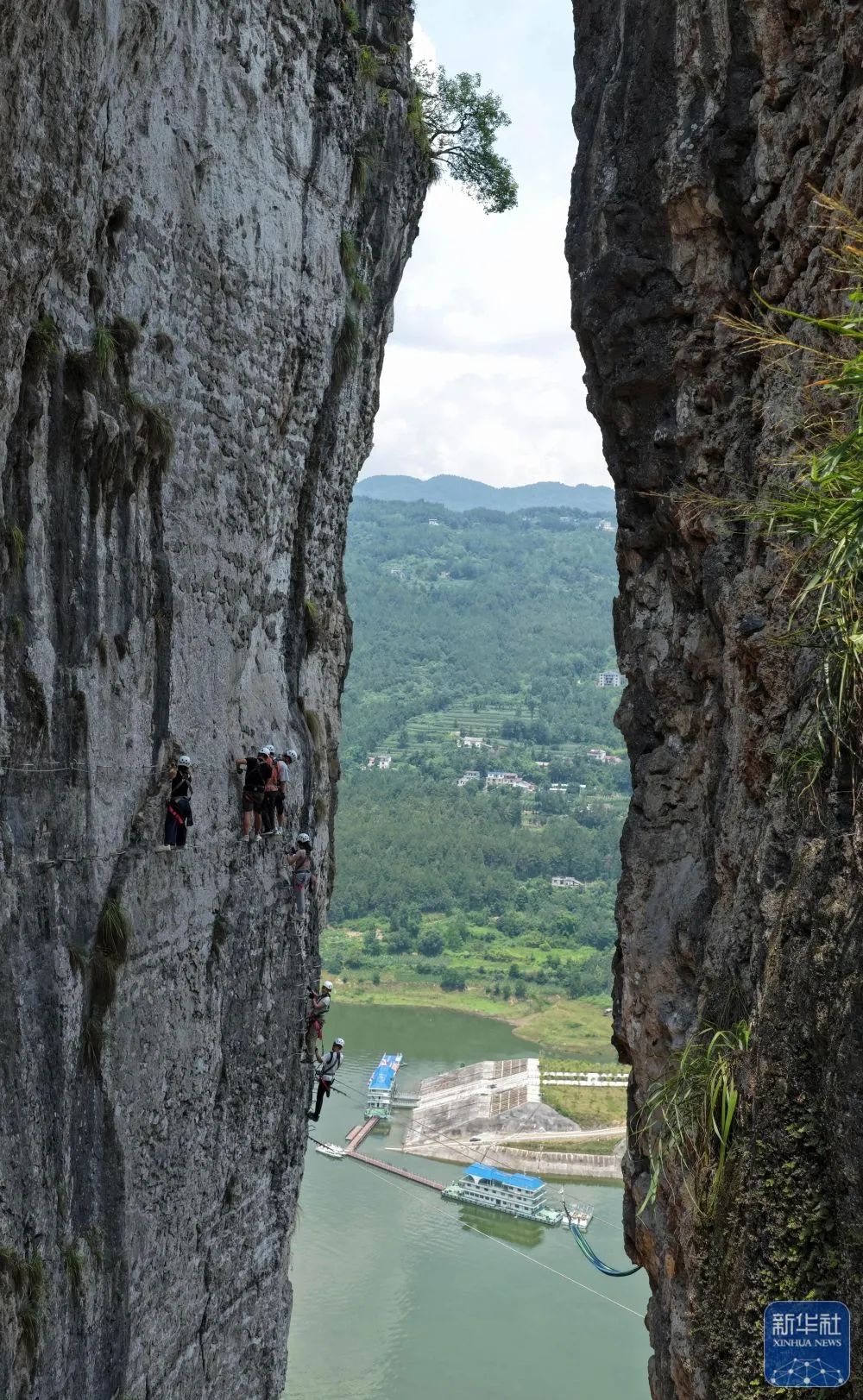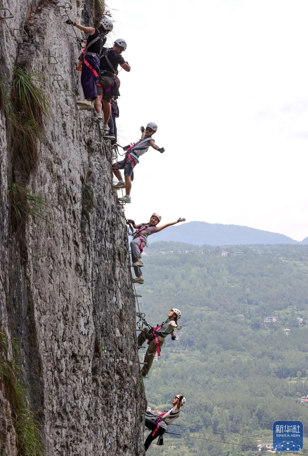 湖北省恩施市新塘鄉紅花峰林景區,游客在體驗“飛拉達”攀巖項目。新華社記者 (伍志尊攝)