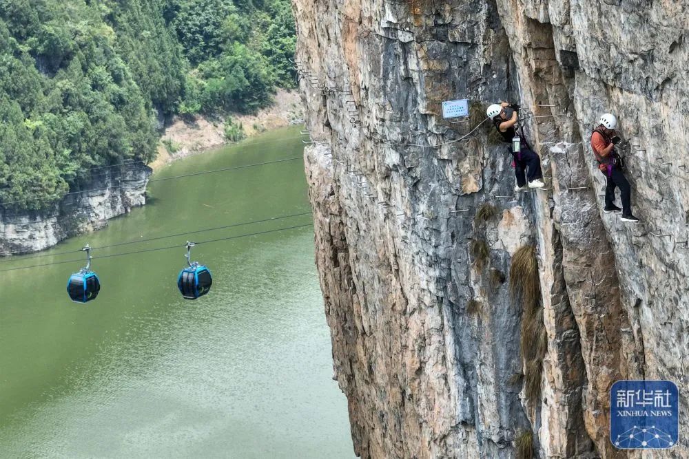 湖北省恩施市新塘鄉紅花峰林景區,游客在體驗“飛拉達”攀巖項目。新華社發(趙軍攝)