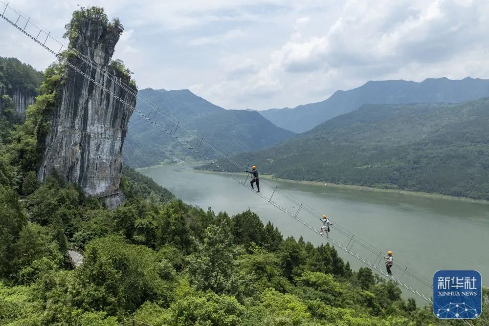 恩施州恩施市新塘鄉紅花峰林景區,游客在體驗“飛拉達”攀巖項目。新華社發(楊順丕攝)