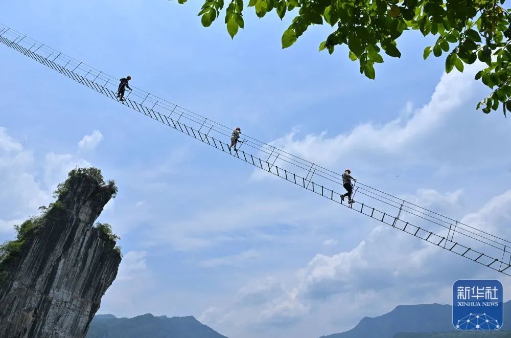 湖北省恩施市新塘鄉紅花峰林景區游客在體驗“天梯”項目。新華社發(宋文攝)