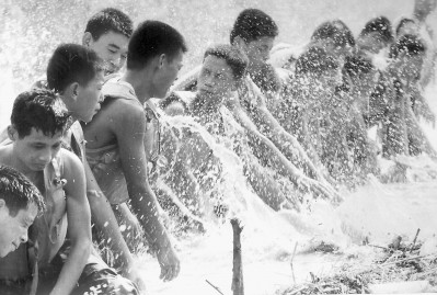 1998年抗洪搶險中,面對洶涌的洪水,戰士們躍入江中,用自己的身體筑成一堵防波堤。新華社記者拍攝/資料圖片